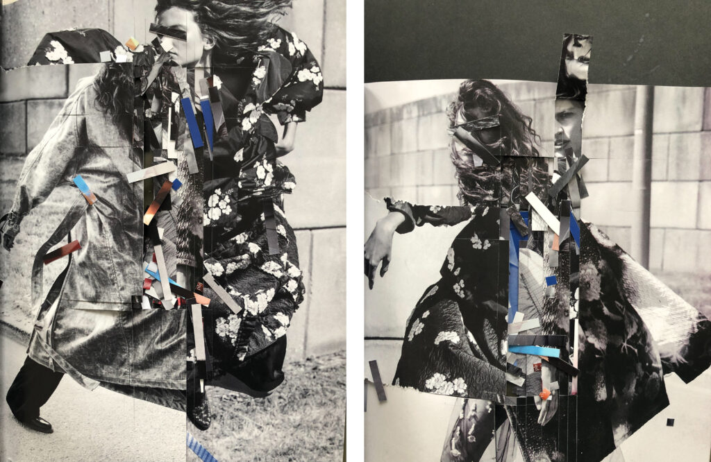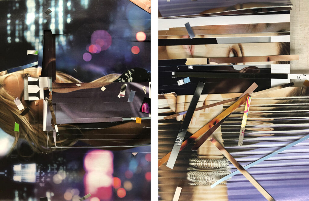 The theme of the painting that is hidden behind the painting is now made up of cuts. These are literal cuts and also die-cutting that projects images into the plans. Instead of brushes, there are knives and scissors, and instead of paints, the pages of fashion magazines. Several collages represent the mixing of worlds, pages, in environment and in time.